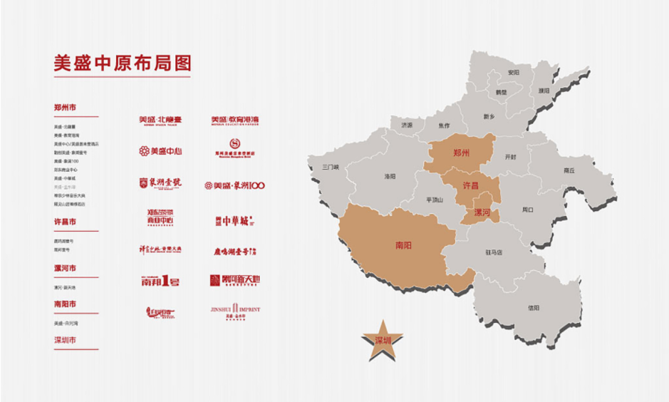 在母品牌兆騰投資集團七大航道加持下,美盛一直全維度參與著城市發展的進程,始終與城市美好同行。先后在漯河、鄭州、許昌、南陽、深圳等地開發了諸多高質量項目,涵蓋品質住宅、城市公寓、寫字樓、商業綜合體等多元業態。