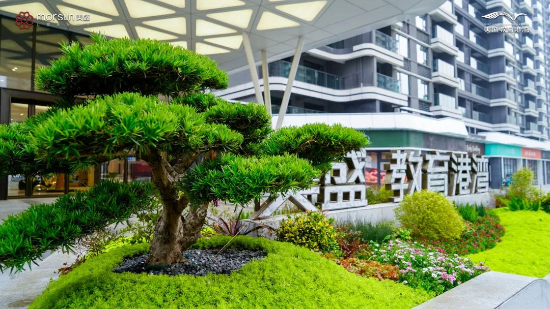 美盛教育港灣一期主入口(南入口)三株層次分明的羅漢松,給業(yè)主一種高尚品質(zhì)的共鳴、賓至如歸的體驗,使業(yè)主和到訪賓客感受家庭溫馨。進入歸家大堂,映入眼簾的藝術裝置,向每位家人詮釋著此間的不凡。