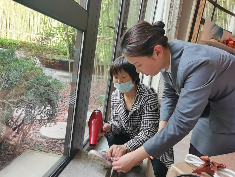 見此情景,項目客服人員來不及多想,穿著高跟鞋就直接踩進水里,抱起孩子,順利把孩子交給奶奶后,客服不放心,擔心鞋子濕了會影響孩子的健康,去二樓拿吹風機把孩子濕透的鞋襪吹干了,奶奶感激的說到:“小孩子太調皮了,謝謝,謝謝你們!”“您客氣了,這是我們應該做的”客服微笑著回答。